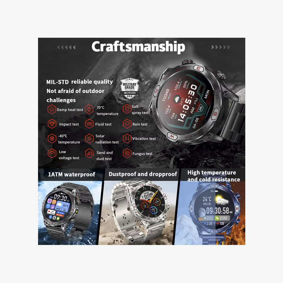 For health-conscious users, it supports 24-hour dynamic heart rate monitoring, blood oxygen, blood pressure tracking, and sleep analysis. With 107 sports modes, an AI voice assistant, LED lighting, 1ATM waterproofing, and military-grade durability, this smartwatch is as versatile as it is stylish.